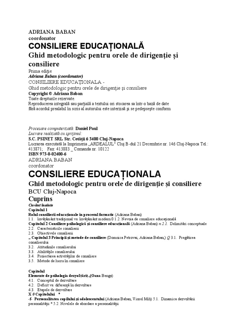 Pdf Adriana Băban Ed Consiliere Educaţională Ghid Metodologic Pentru Orele De Dirigenţie și Consiliere Educational Counseling Guidelines For Pupils Guidance Class 1st Edition Imprimeria Ardealul Cluj Napoca 2001 258 P Book Review