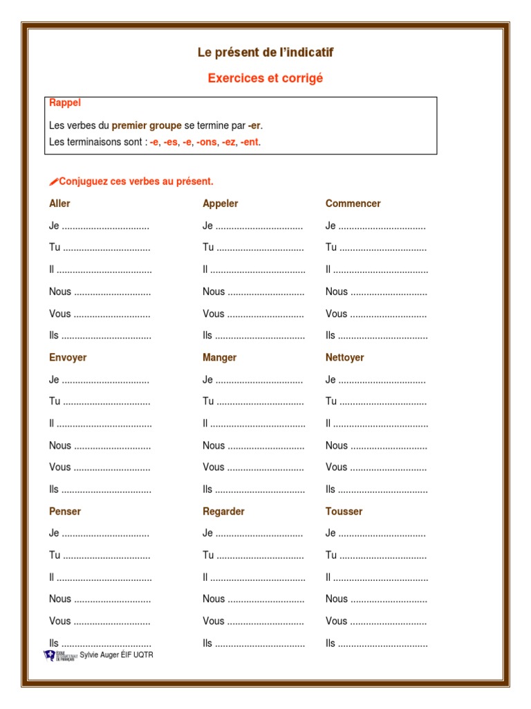 L Indicatif Present Des Verbes Du 1er Groupe Exercices