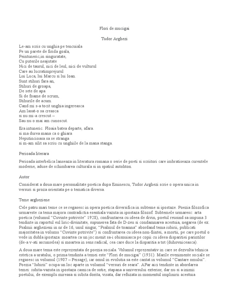 Flori De Mucigai Docx Poet Cu O Activitate Literara Indelungata Si Deosebit De Bogata Tudor Arghezi Se Inscrie Deopotriva In Traditie Si In Course Hero