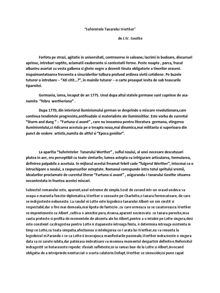 I Goethe Suferințele Tanărului Werther Un Rezumat Al Capitolelor Literatură 2020