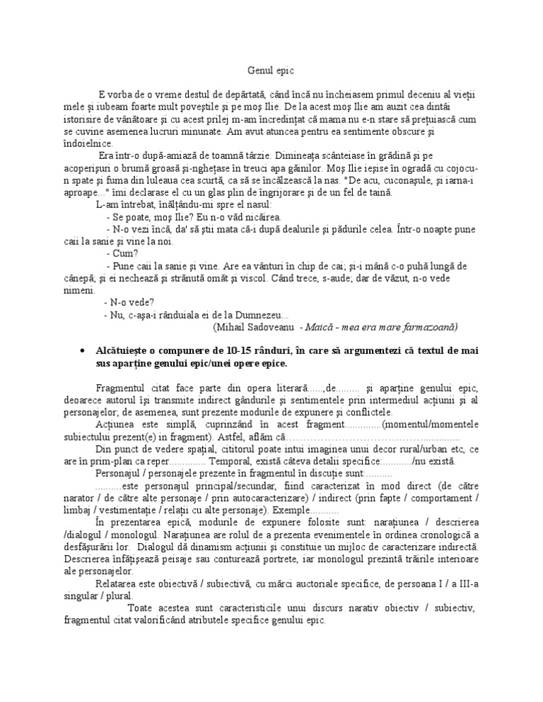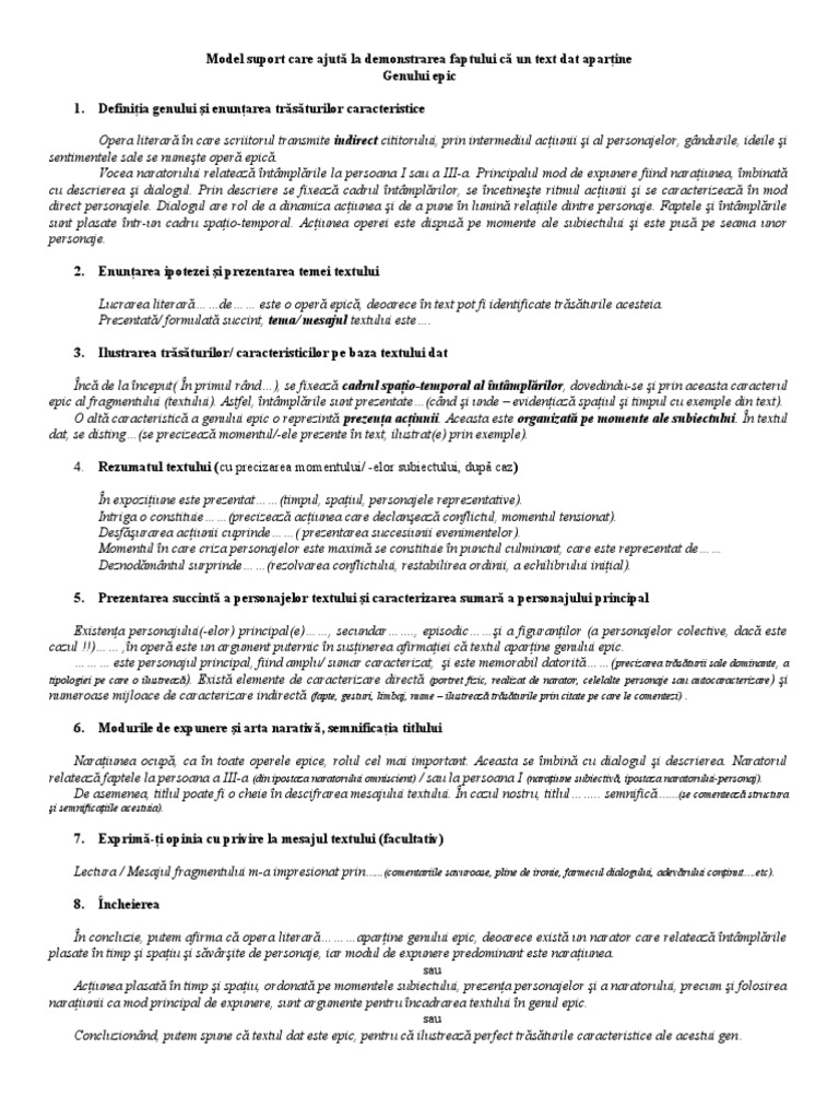 Model De Argumentare A Apartenenţei Unui Text La Genul Epic