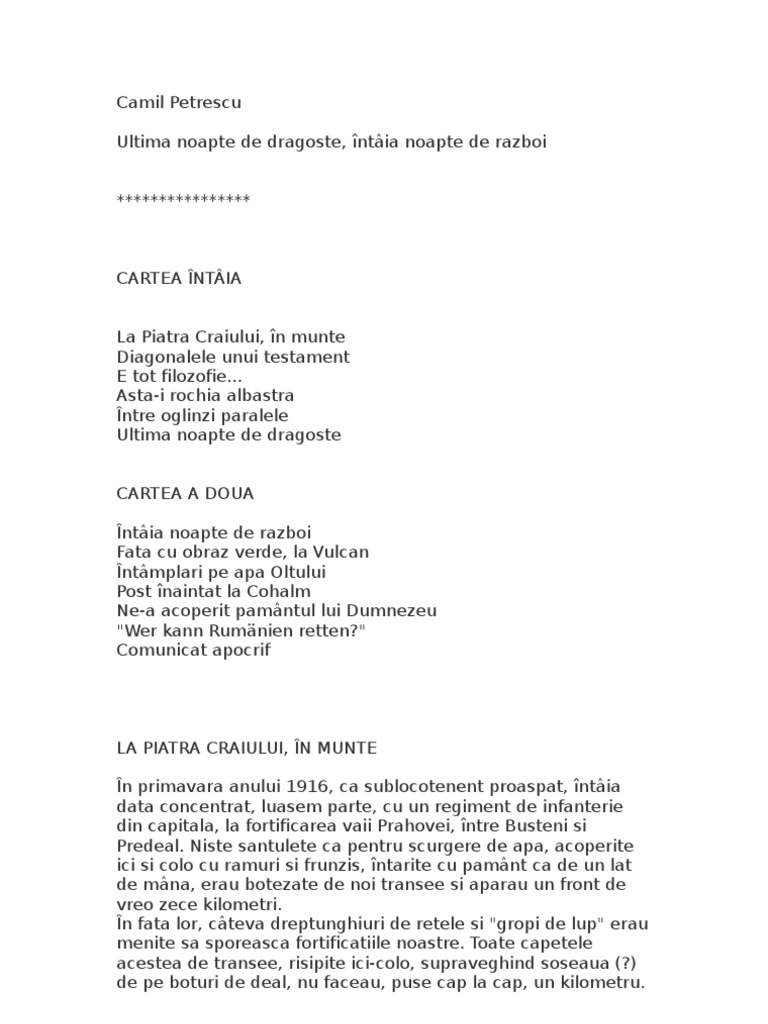 Ultima noapte de dragoste intaia noapte de razboi pret. Asta i rochia albastra între oglinzi paralele ultima noapte de dragoste ca rtea a doua întâia noapte de razboi fata cu obraz verde la vulcan. 24 00lei 18 00 lei adaugă în coș 25 vezi detalii camil petrescu ultima noapte de dragoste intaia noapte de razboi in stoc pret. . Stefan gheorghidiu s a despartit de ela de tot trecutul cum spune el insusi si se afla pe front in linia intai undeva intre campulung muscel si bran drum de munte pe care l strabate de mai multe ori.